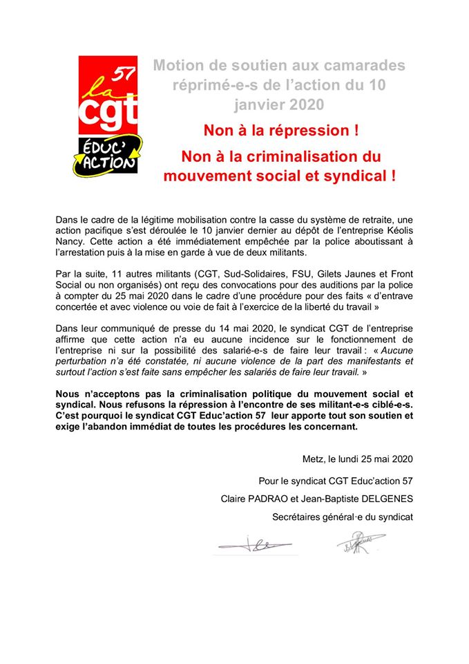 Motion de soutien aux camarades réprimé-e-s..., FSU 54 Pays Haut, 29 mai